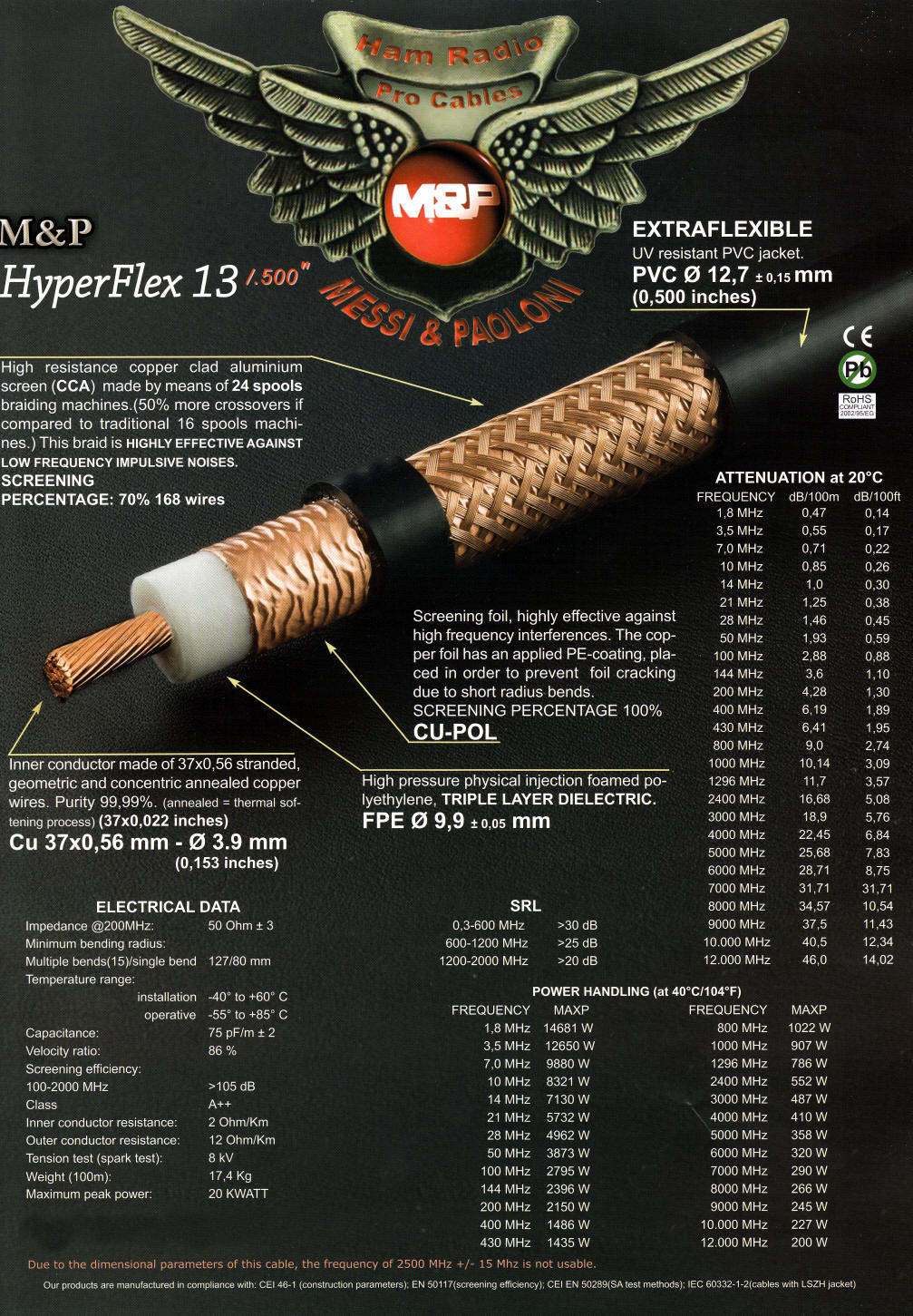 •extrem hohes Schirmungsmaß >105 dB•wasserdicht, flexibel und rotortauglich•Außenleiter mit PE-beschichtet, daher kleine Verlegeradienmöglich•UV-resistent•37-drähtiger Innenleiter•bis zu 12 GHz Frequenzbereich•in allen Längen bis 800 m lieferbar