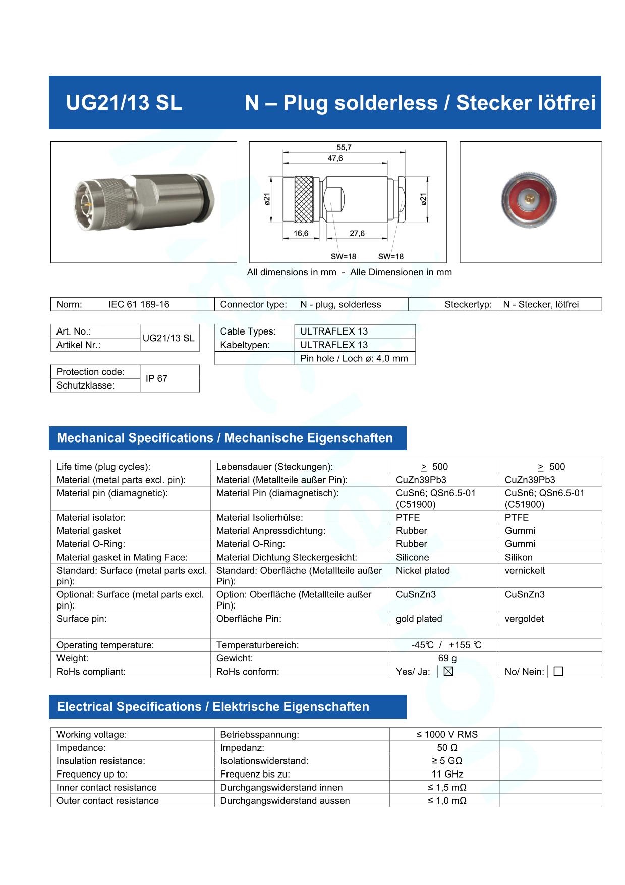 Unser UG 21-13 TA verzichtet auf Lötarbeiten und Crimpwerkzeug. Er lässt sich durch seine vier Schlitze in den diamagnetischen Mittelstiften
