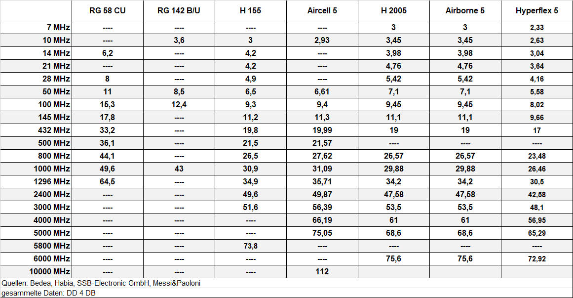 alle Zahlenangaben in dB / 100 m @ 20°C