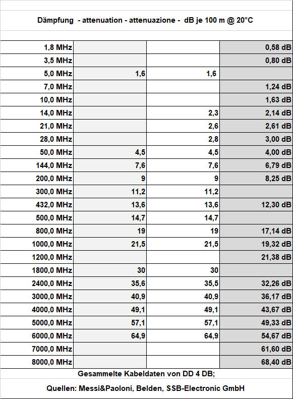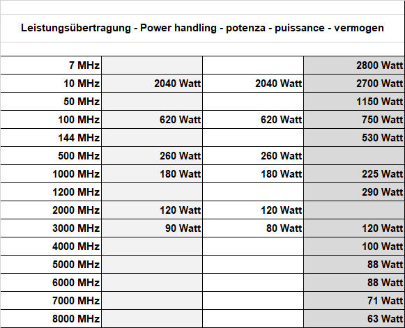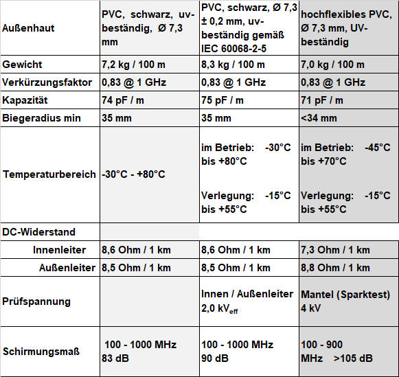 Vergleichstabelle für 7mm Koaxialkabel